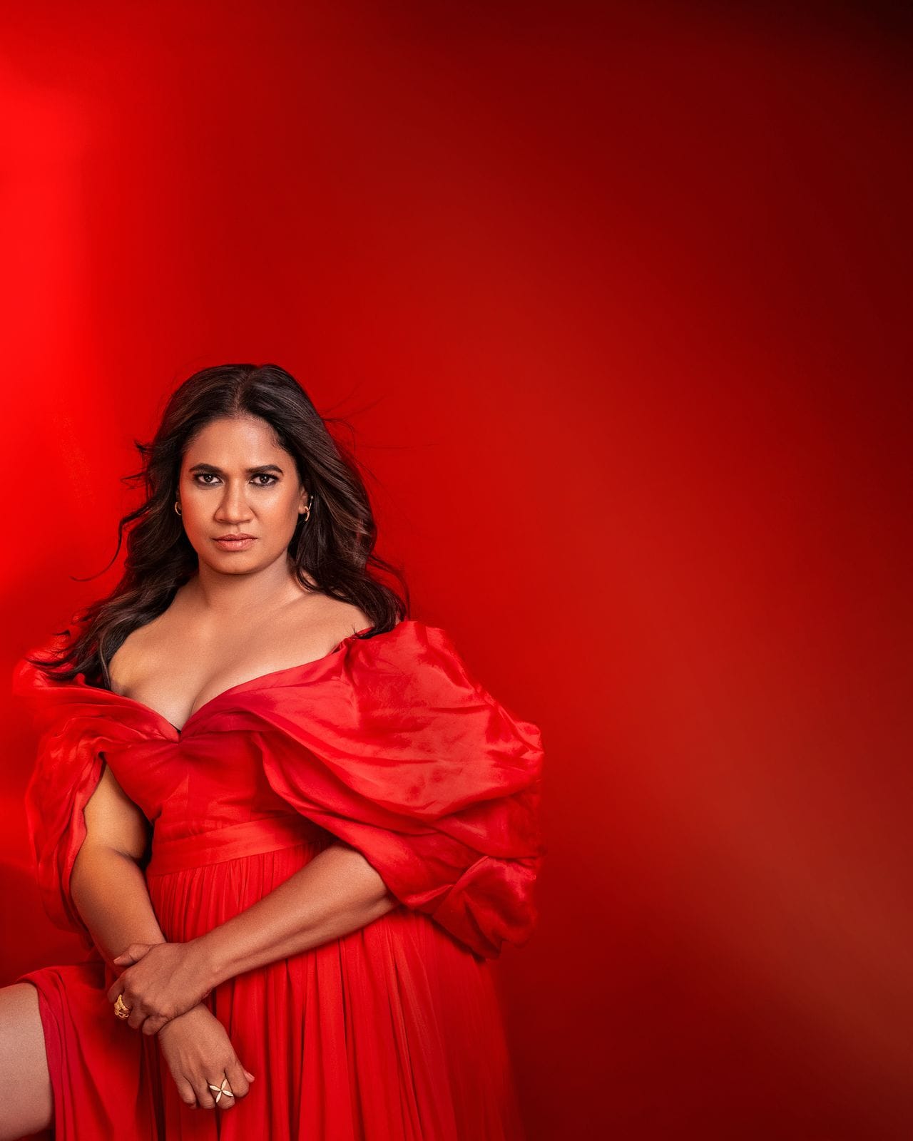 लाल रंगाच्या डीप नेक, हाय स्लीट ड्रेसमध्ये छाया कदमचं अनोखं फोटोशूट