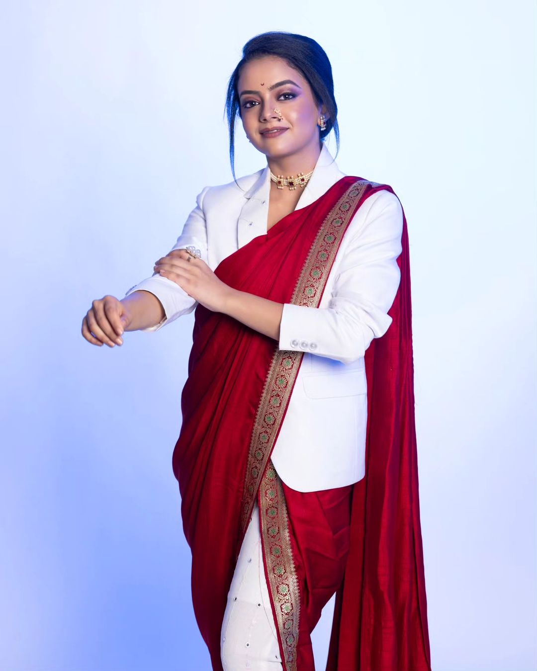 लाल साडीवर अभिनेत्रीने परिधान केला कोट