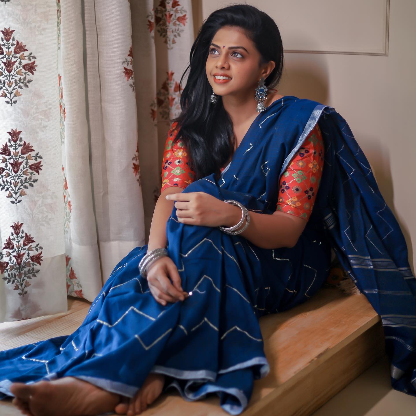निळ्या रंगाच्या साडीवर अभिनेत्रीने परिधना केला केसरी ब्लाउज