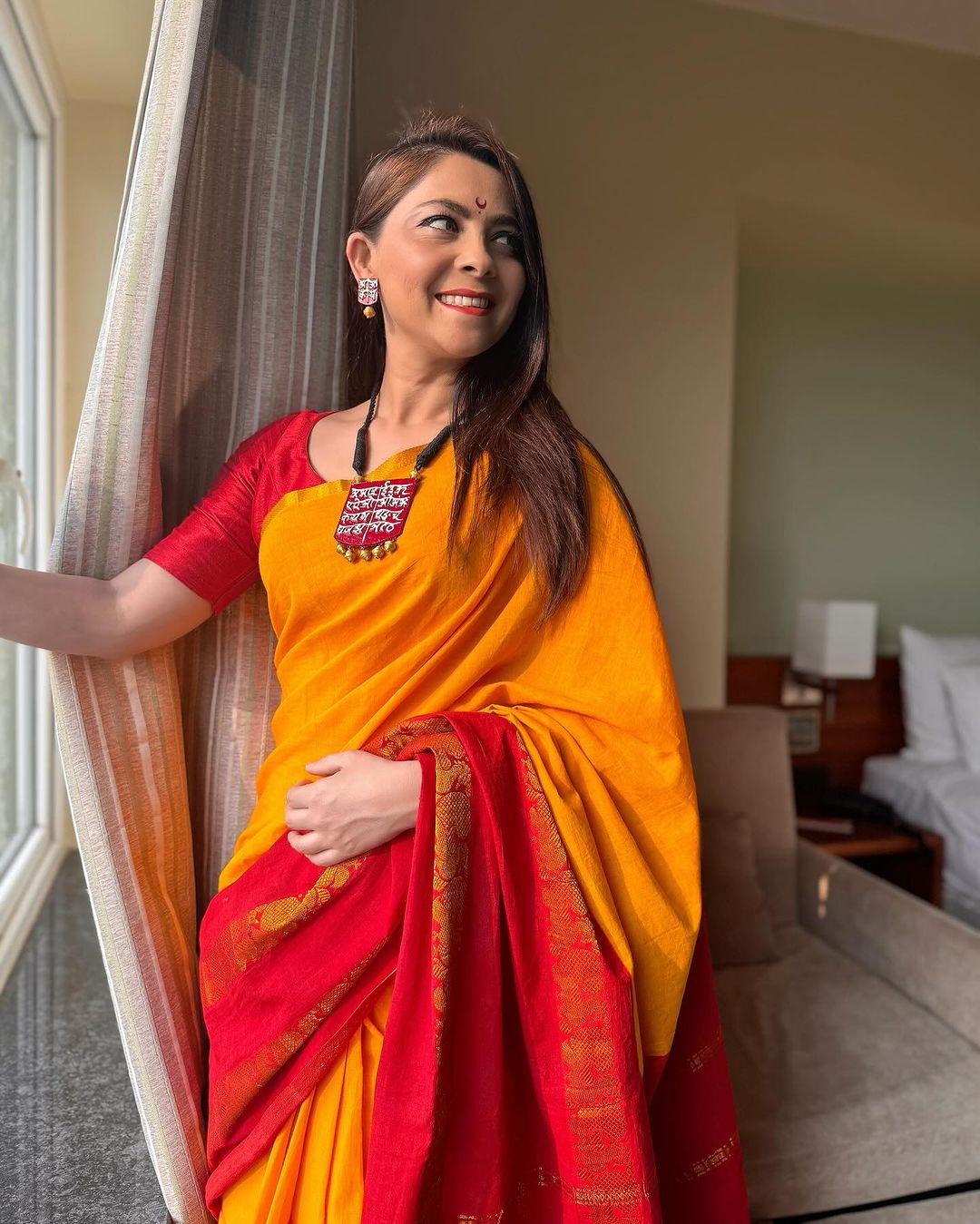 पिवळ्या साडीवर अभिनेत्रीने परिधान केला लाल रंगाचा ब्लाऊज