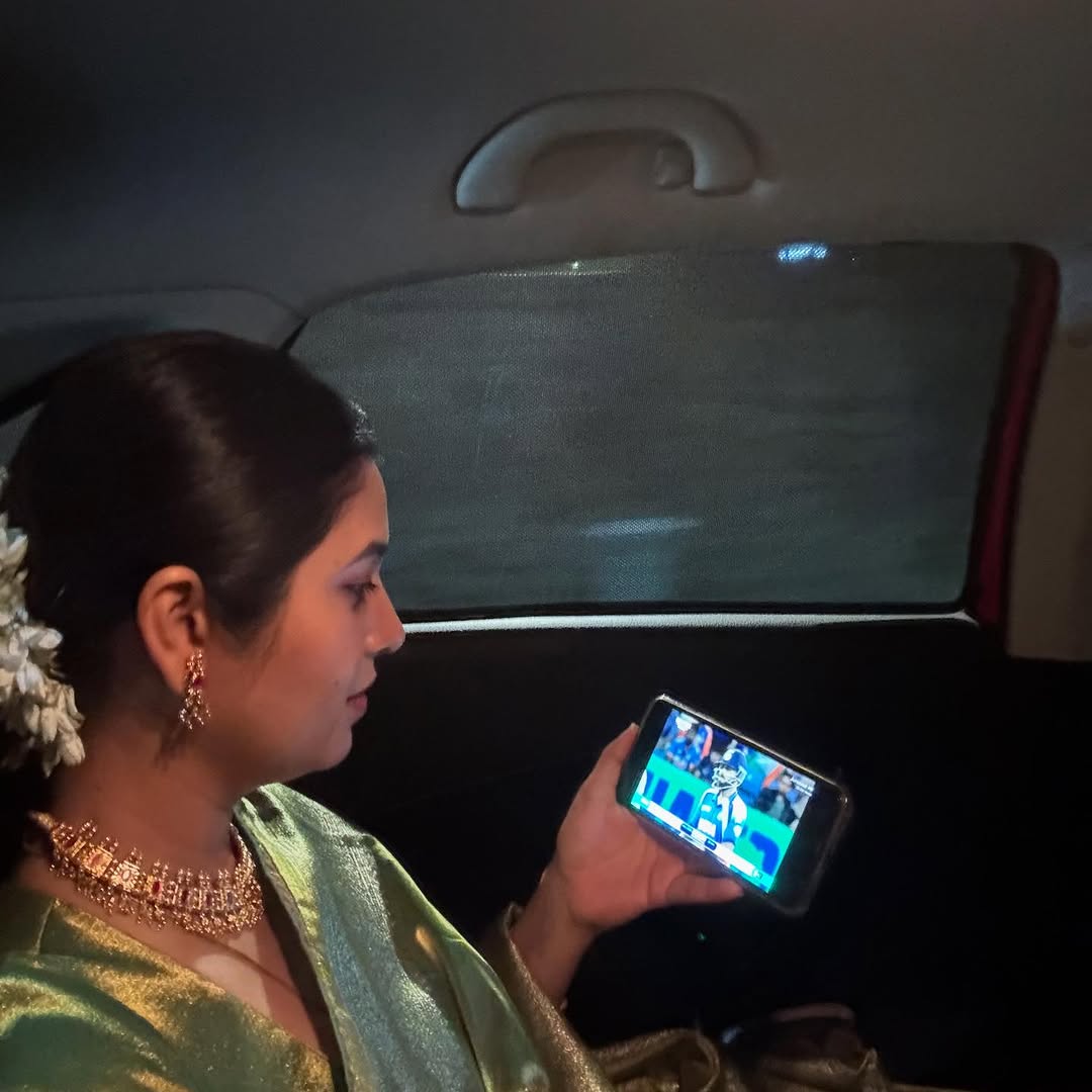 कारमध्ये बसून प्राजक्ता तिच्या मोबाइलमध्ये मॅच पाहताना दिसली